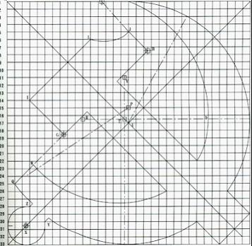 3 镰刀的画法:以M点(17、17′)为圆心、MN(N点为17、1′)为半径画弧⌒NO(O点为17、33′);以P点(17、15′)为圆心、PO为半径画弧,与HG的延长线交于Q点;以R点(1116′、17′中点)为圆心、RN为半径画弧,与通过R点的水平线交于S点;以T点(16、1716′、17′的中点)为圆心、TS为半径画弧,与通过T点的垂直线交于U点;以V点(16、1711′中点)为圆心、VU为半径画弧,与HG的延长线交于W,构成镰刀。以X点(3、4 30′、31′的中点)为圆心作圆与AB、BC线相切,从Y点(6、30′)、Z点(4、28′)分别作直线平行于BD,构成镰刀把。
